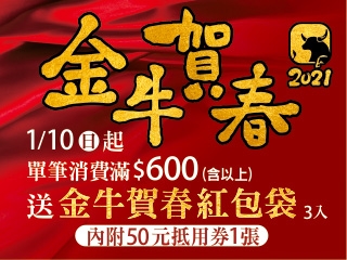 1/10起,單筆消費滿$600(含以上) 送『金牛賀春‧紅包袋(3入1組) 』,內附「50元抵用券」1張