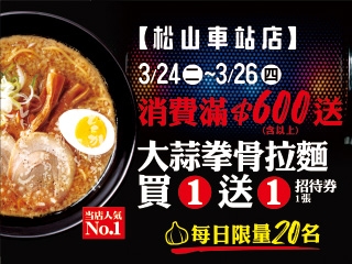 消費滿$600(含以上)送大蒜拳骨拉麵買1送1招待券1張!