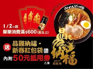 2018/1/19(五)單筆消費滿$600(含)以上,送新春紅包袋(1組3入共兩款),內附50元抵用券乙張。