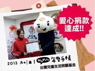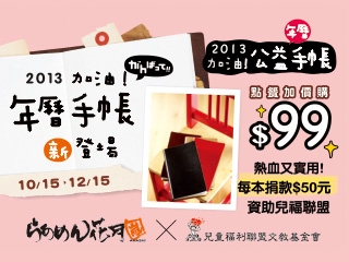 *發售終了*2013加油!公益年曆手帳 邀您傳遞一碗拉麵的溫度*發售終了*2013加油!公益年曆手帳 邀您傳遞一碗拉麵的溫度熱血又實用的2013加油!公益年曆手帳 點餐加價購$99元 每本捐款$50元資助兒福聯盟「搶救生命棄兒不捨」出養兒童生活照顧基金。 再附贈$50元抵用券12張(總值$600元) -