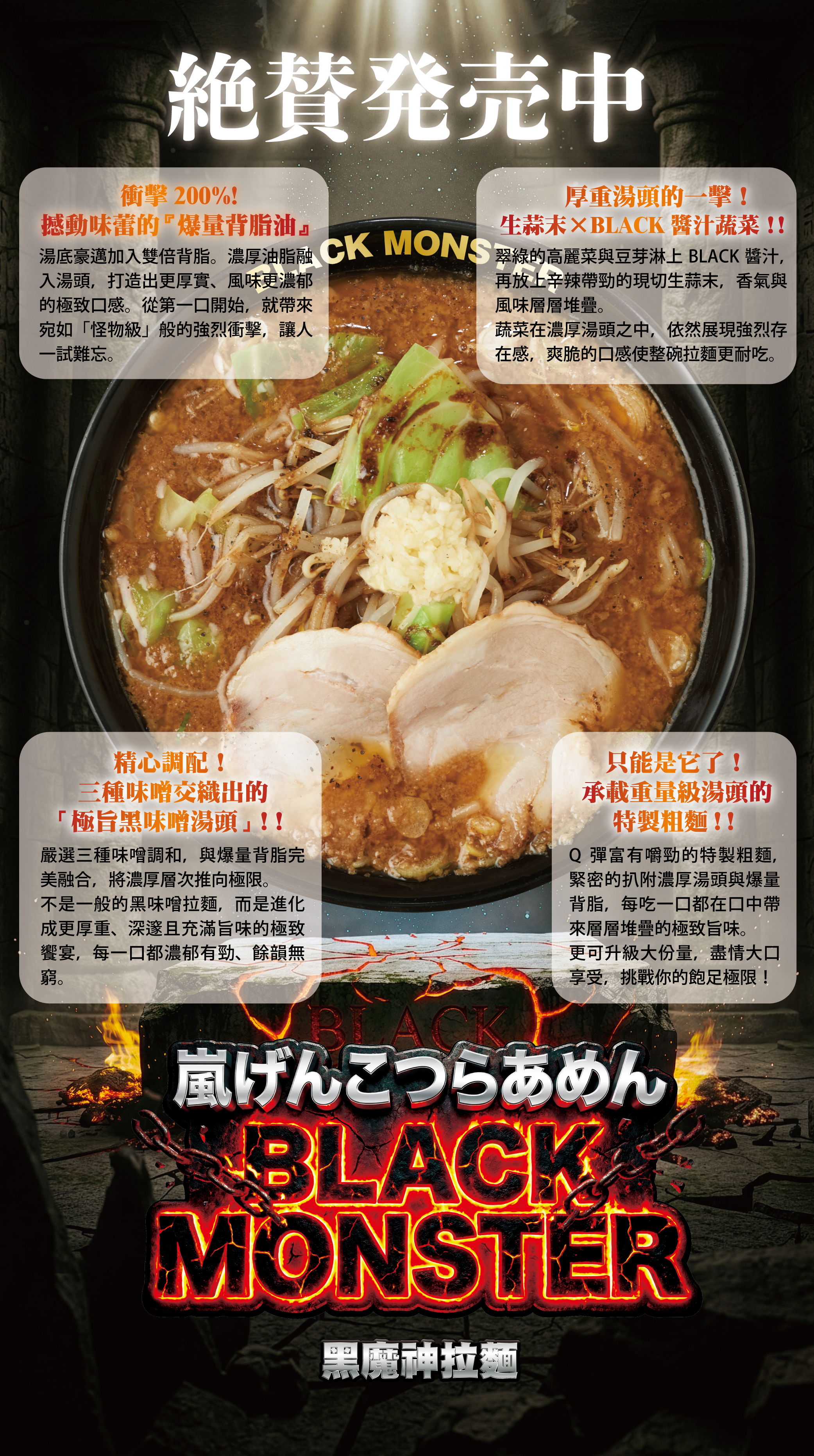 【黑魔神拉麵】 爆量背脂與三種味噌打造出風味濃郁的湯頭 搭配爽脆的蔬菜與特製粗麵 再加入一球生蒜末 濃厚旨味的極致饗宴讓人一試難忘。 ※ 黑魔神拉麵 NT$260 4/28 (二)新品登場! *餐點食材如有調整將以現場提供為主